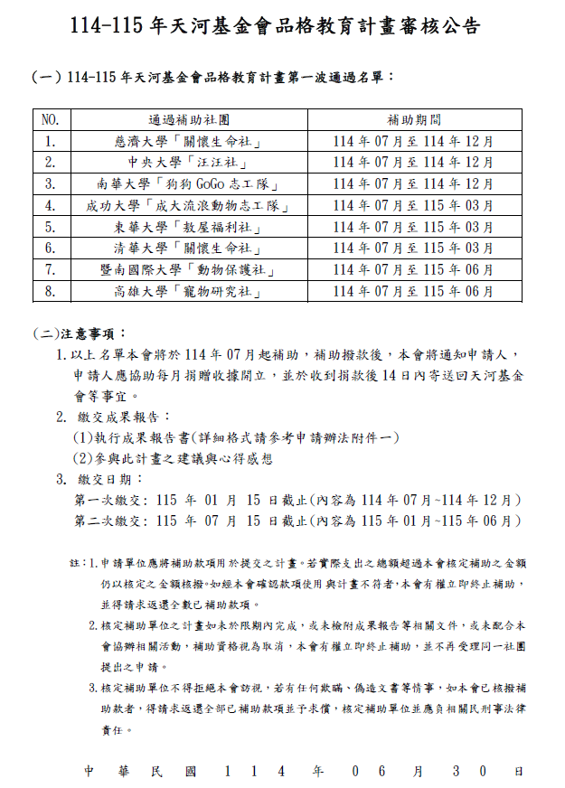 品格教育計畫自2019年開辦至今,過去五年已補助全台22間大學動保社團、累積逾900次校園動物受助次數。歡迎更多校園動保社團申請,讓天河成為社團溫柔的靠山,陪伴大家在校園共築浪浪的避風港,守護每個遇見