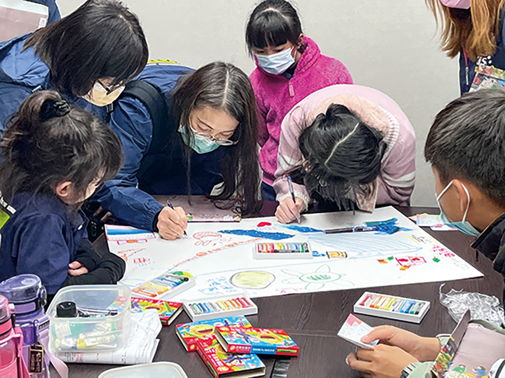 導覽結束後,徐建國老師以「給天河的禮物」為主題,帶著仙草師生用蠟筆聯合創作。徐建國老師選了最喜歡的藍色,快手繪出一隻能承載許多禮物的大翅鯨,接著便讓師生各自揮灑創意、畫出感謝,留下此次活動的繽紛回憶。